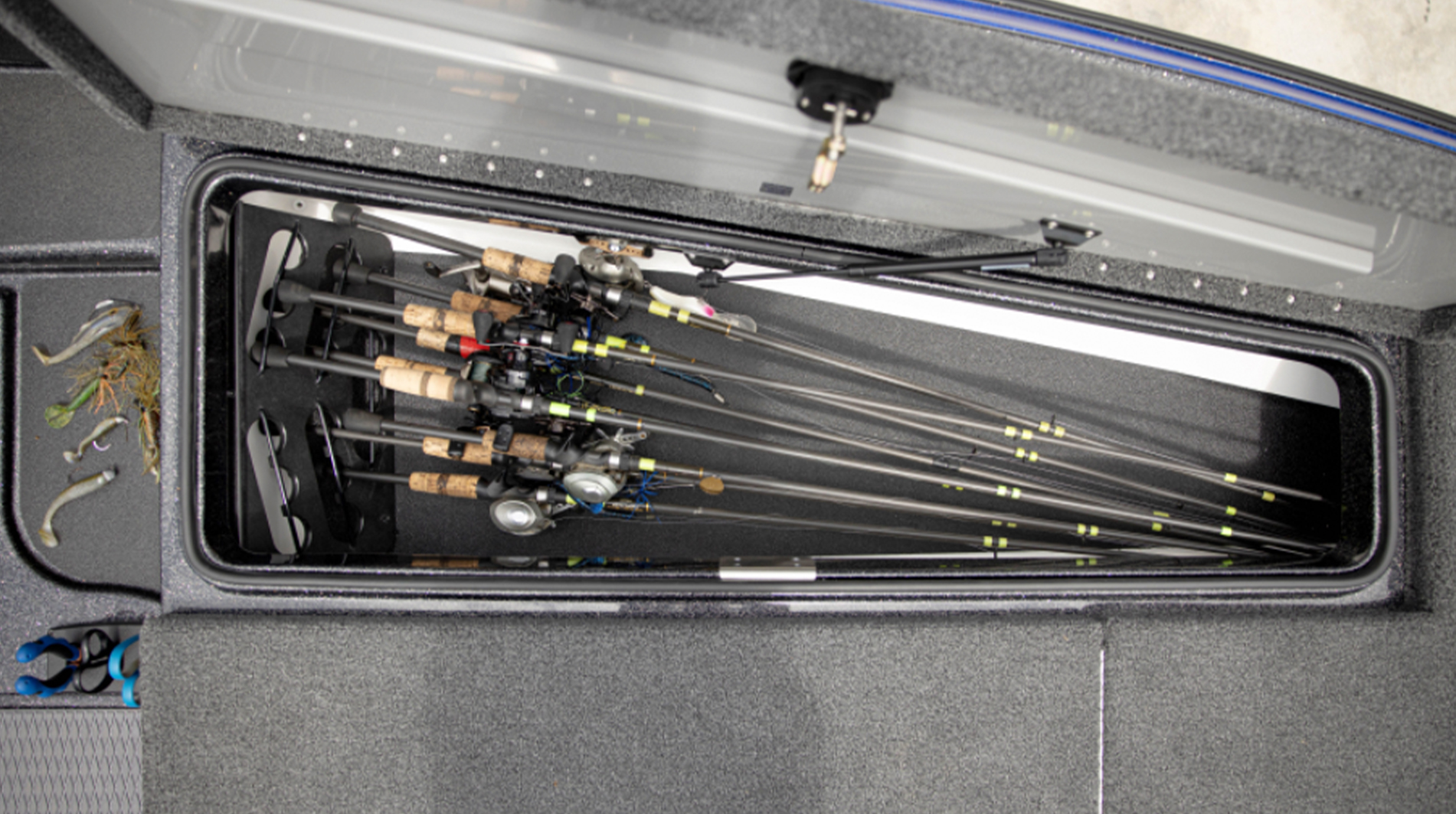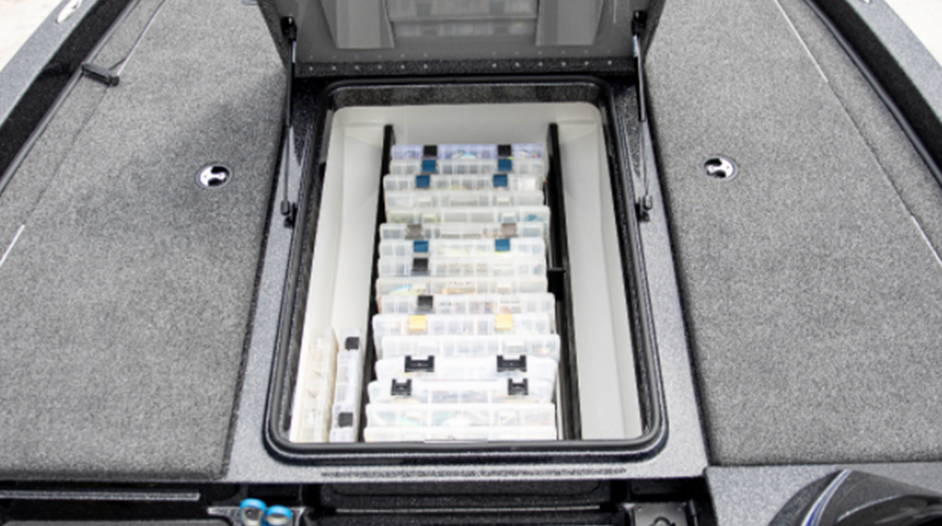 ボートのリアストレージは容量が大きく、充電システム、バッテリー4台、シャローアンカー用ポンプなどを収納してもまだ余裕があります。